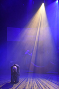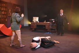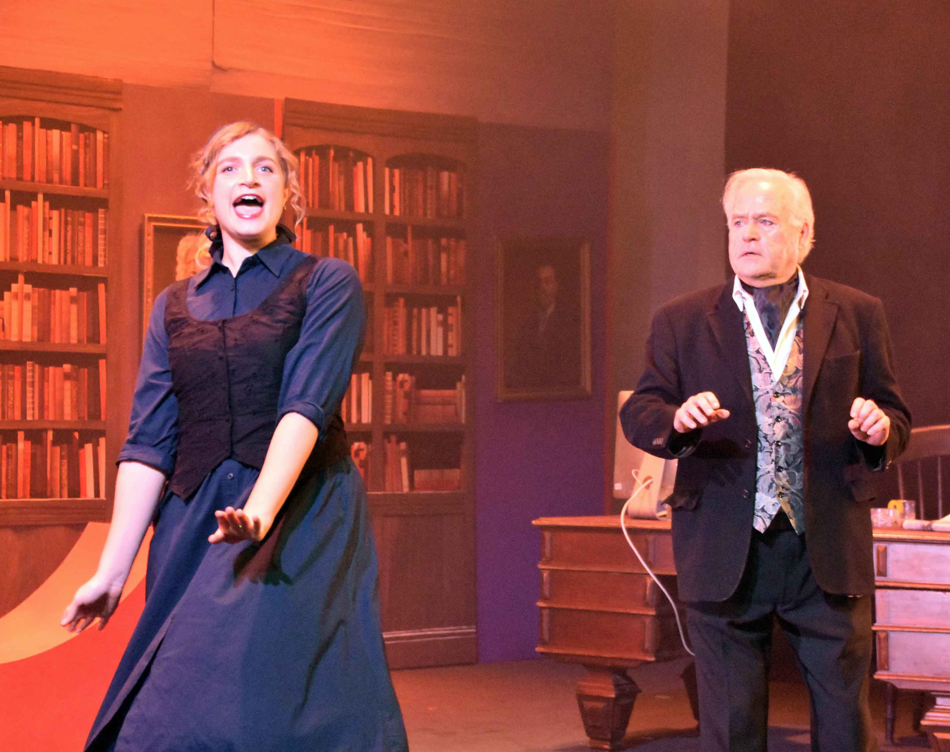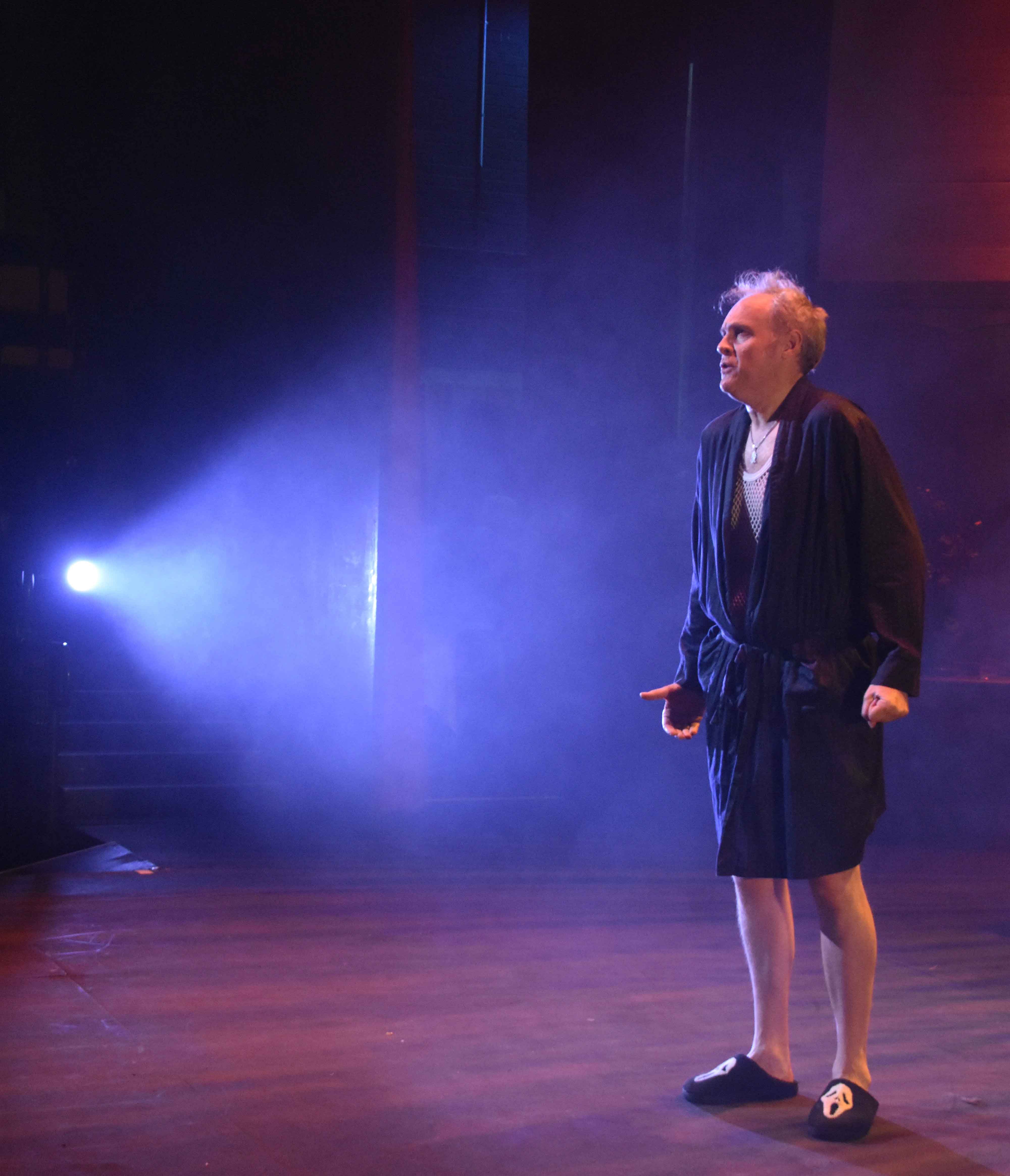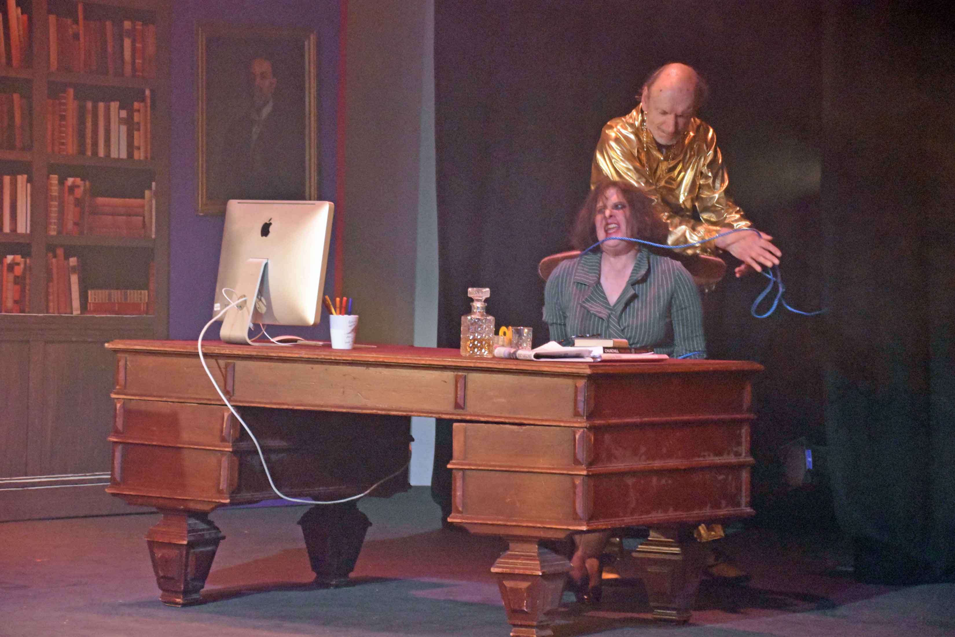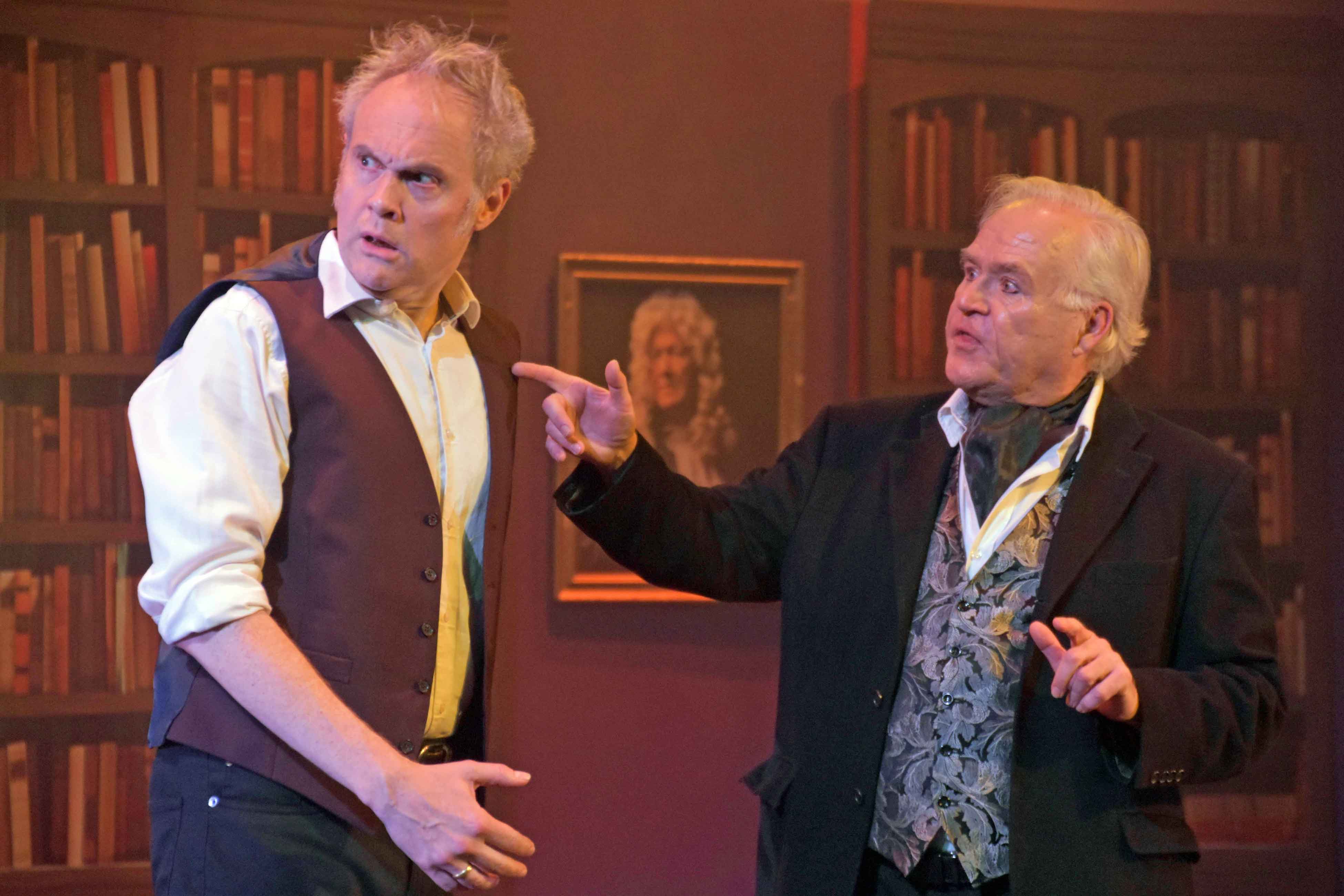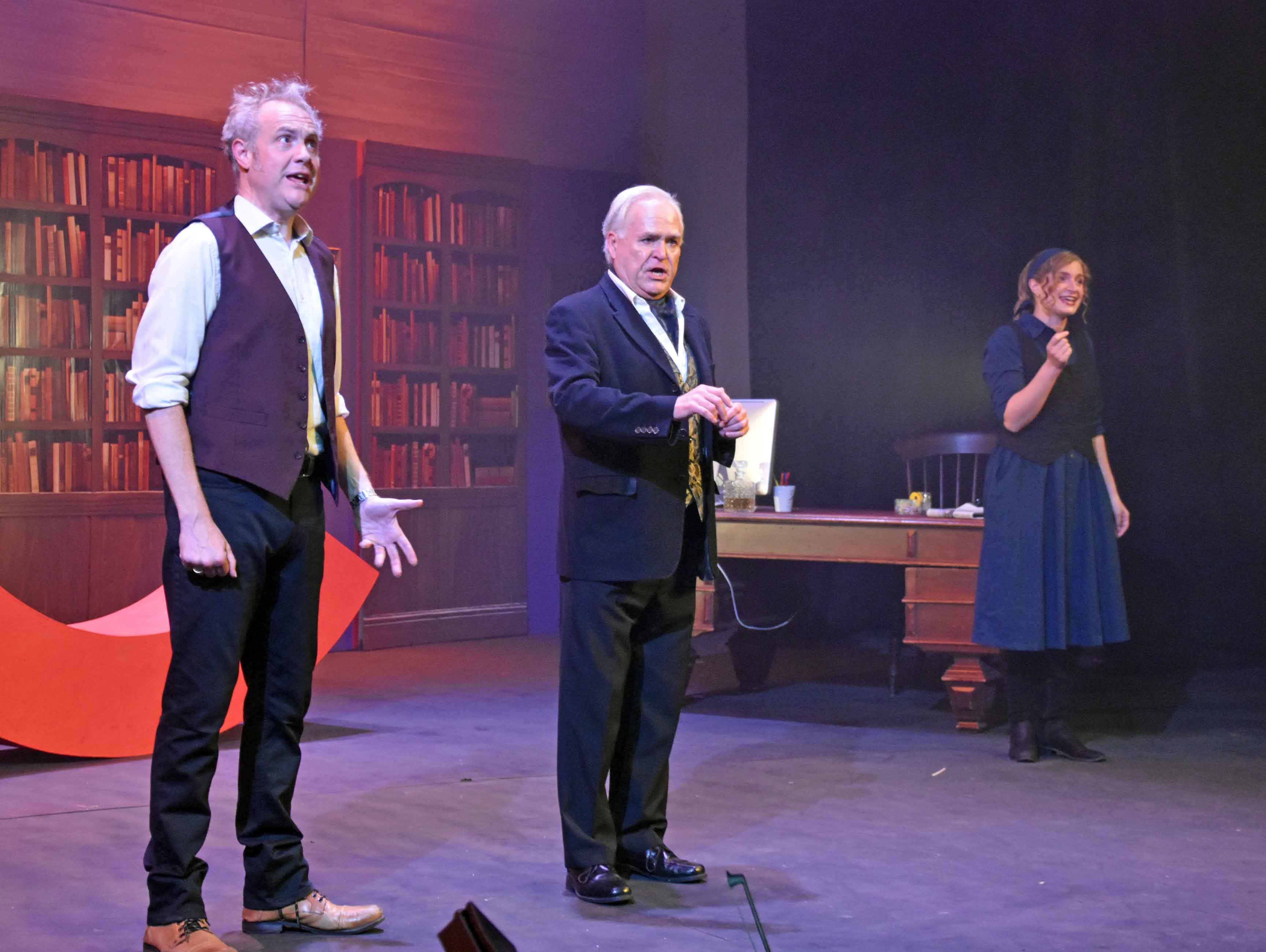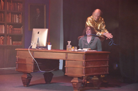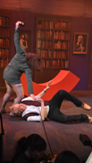 The first act was set around a coffee shop with Robin diguised as a barrista, and act 2 featured Ruthven's office with ghosts entering "through" the bookcases.