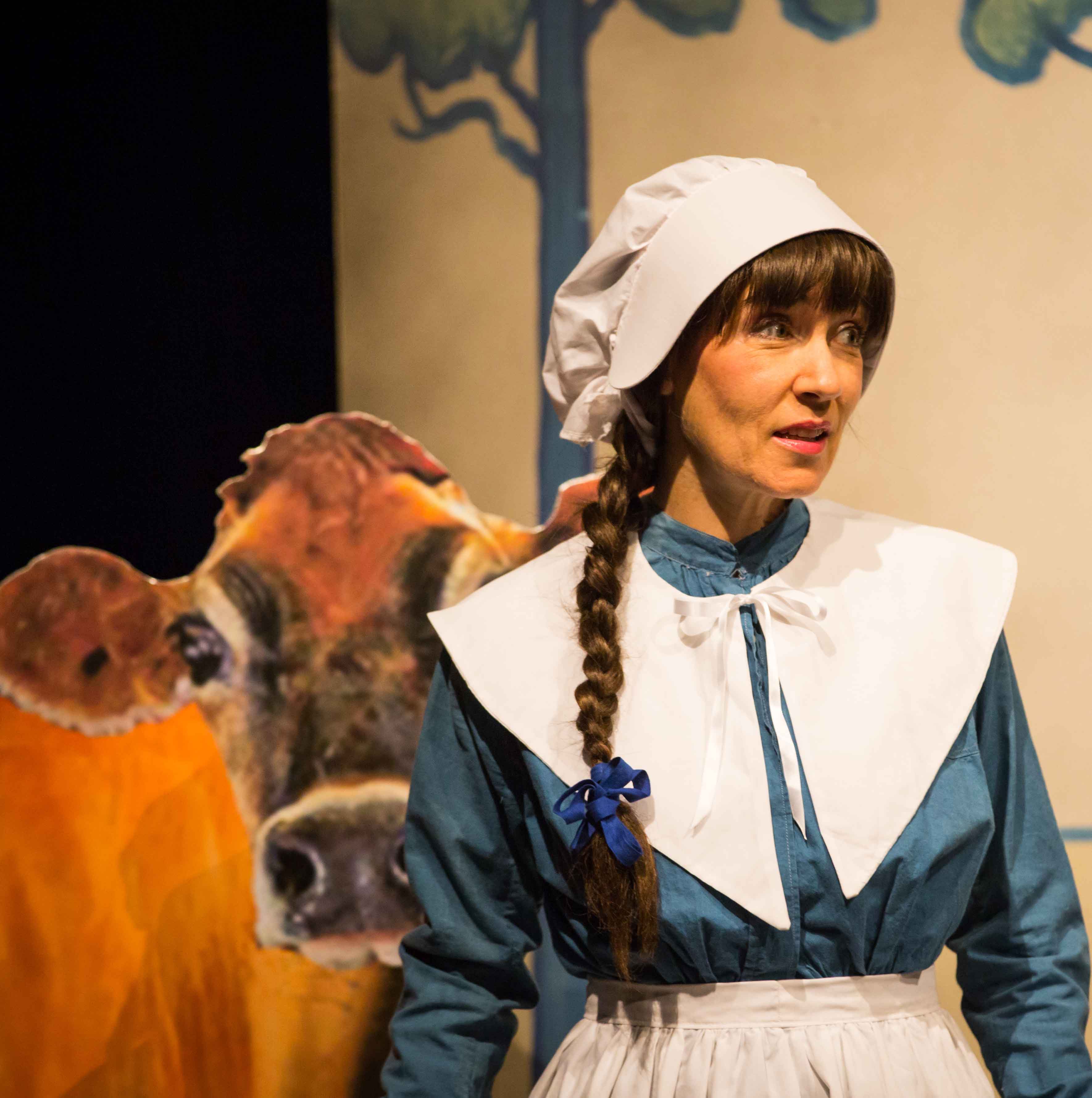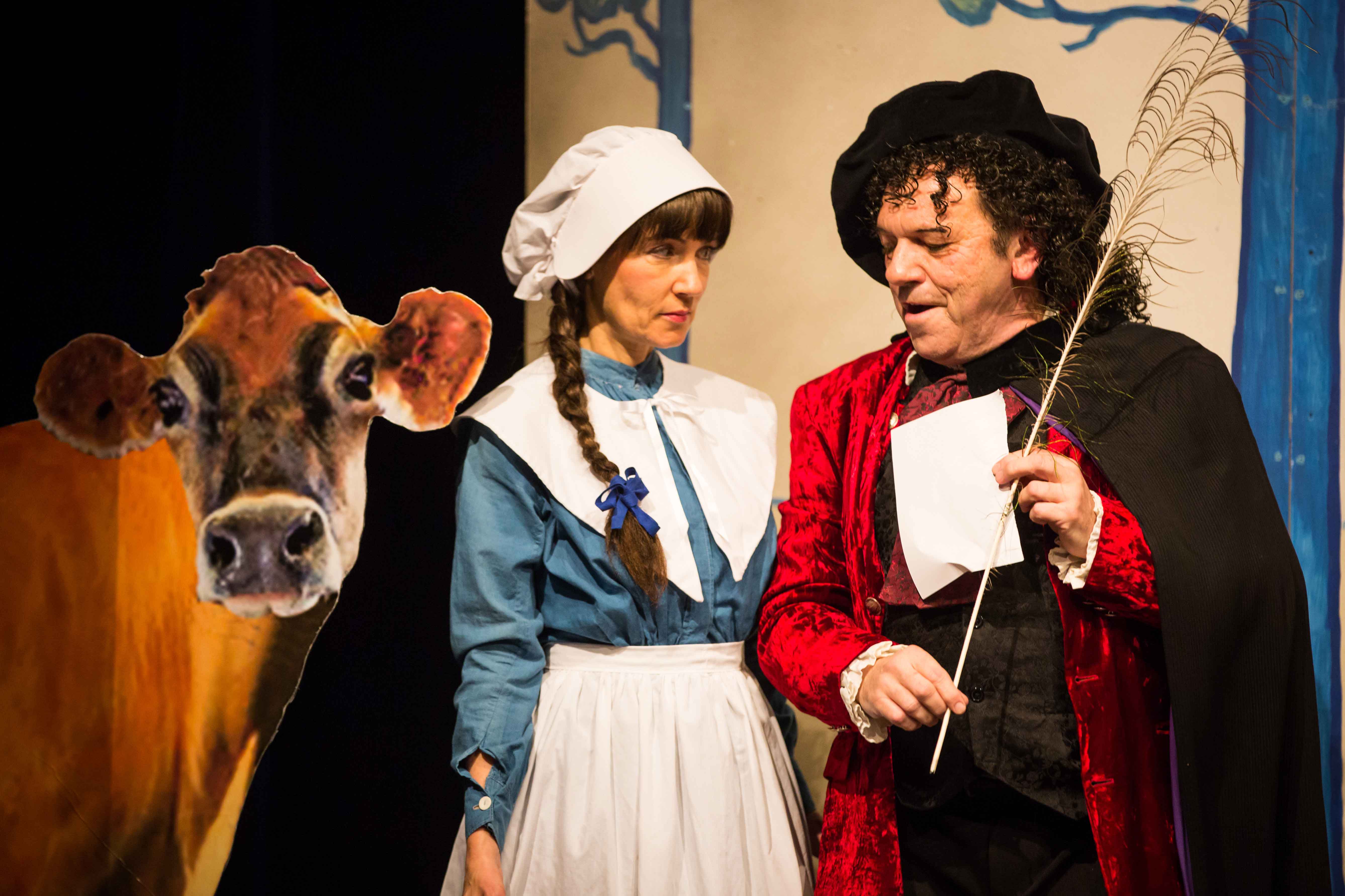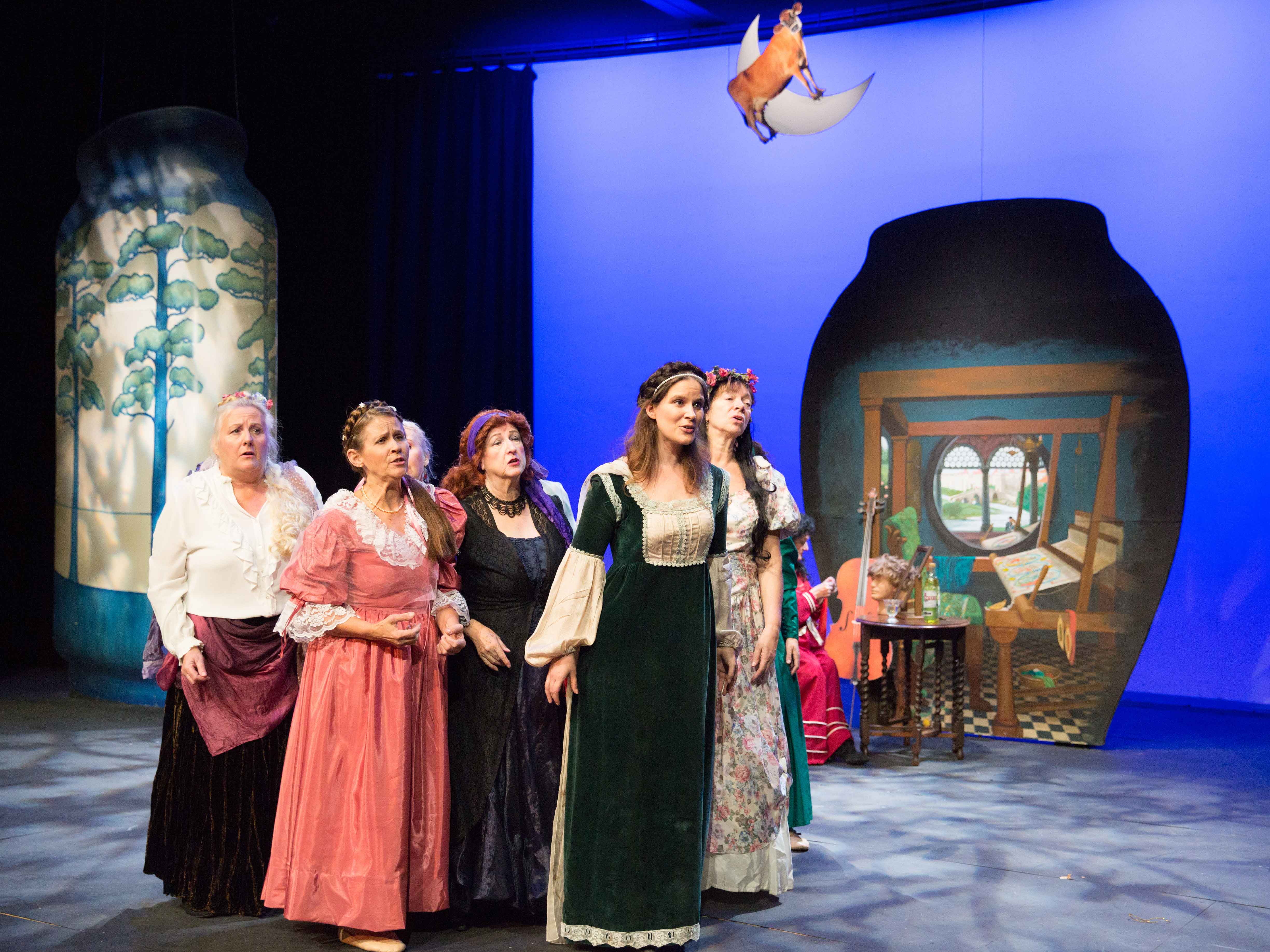 The production was distinguished by the three dimensional (Trompe-l'oeil) scenic vases created by Martin Jarvis, and the lifelike cow conveniently moved into postion when required, and which jumped over the moon!